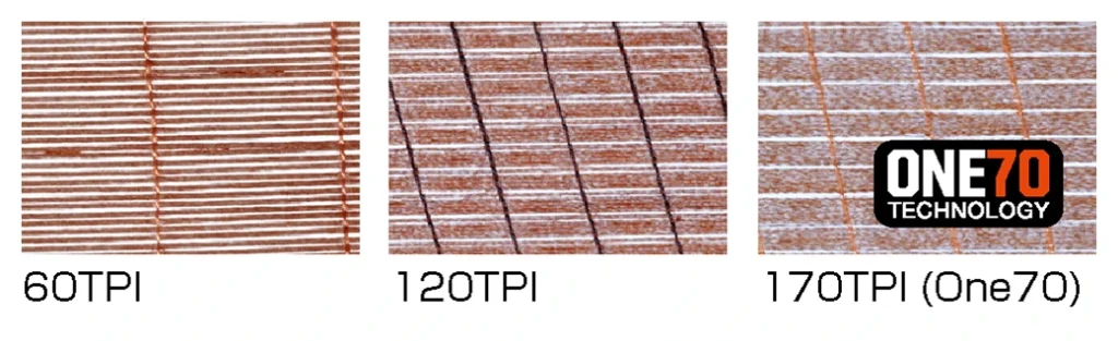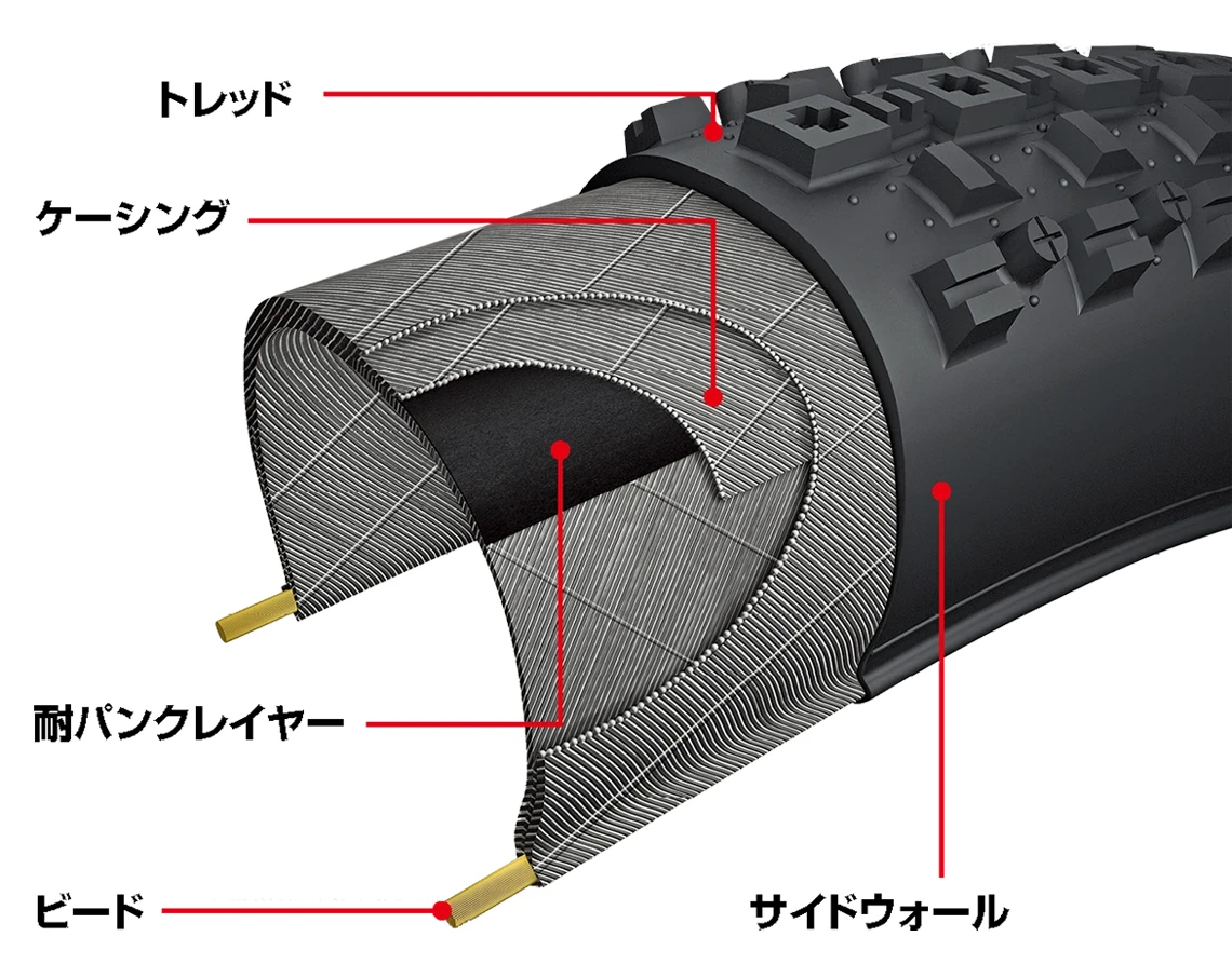 ビードからビードまでを覆うナイロンの層をケーシングと呼びます。TPI値(1平方インチ内の繊維の数)が低いと強度と耐パンク性能が高くなり、TPI値が高いと軽くしなやかなタイヤになります。